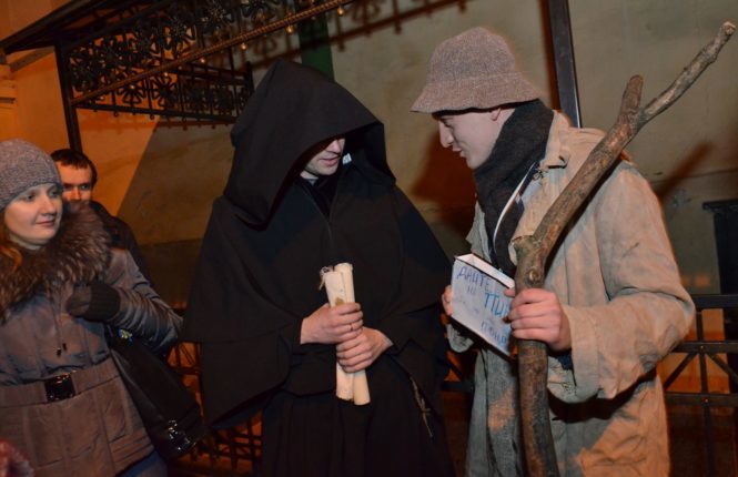 Барон жебраків особисто покаже Вам свої володіння і навіть «по секрету» розповість як можна було отримати у Львові «ліцензію» на жебракування. Охочих він навчить своєму ремеслу і підкаже, як стати мільйонером, не сплачуючи податків! Монах заведе усіх екскурсантів до наймістичнішого підземелля Львова. Там він покаже свої келії й розповість про те, кому треба дякувати за смачне львівське пиво. Львівський батяр розкаже про танці, мову і жартівливу культуру львівських батярів